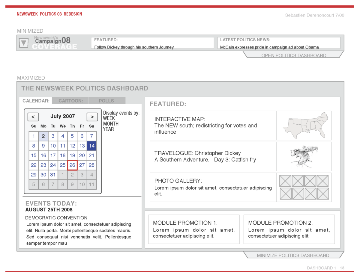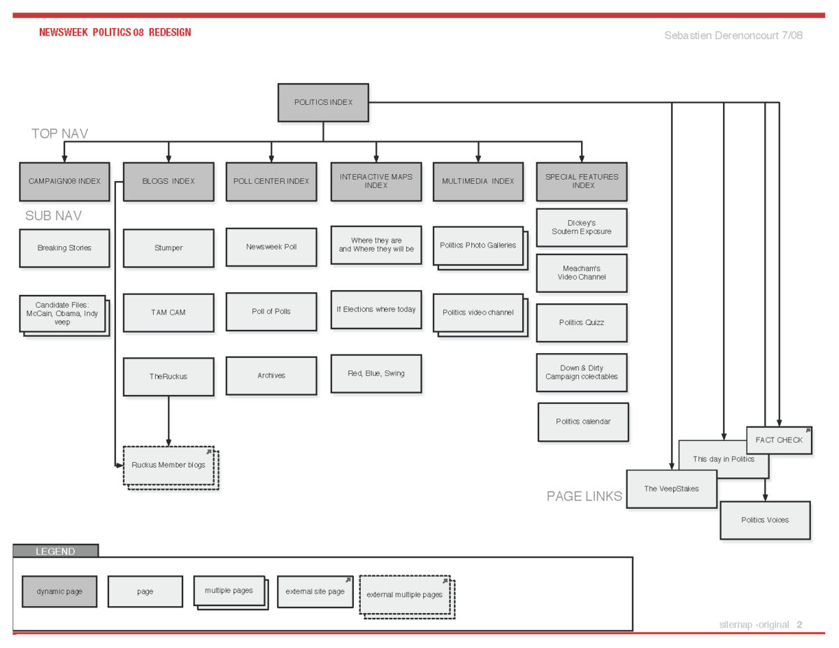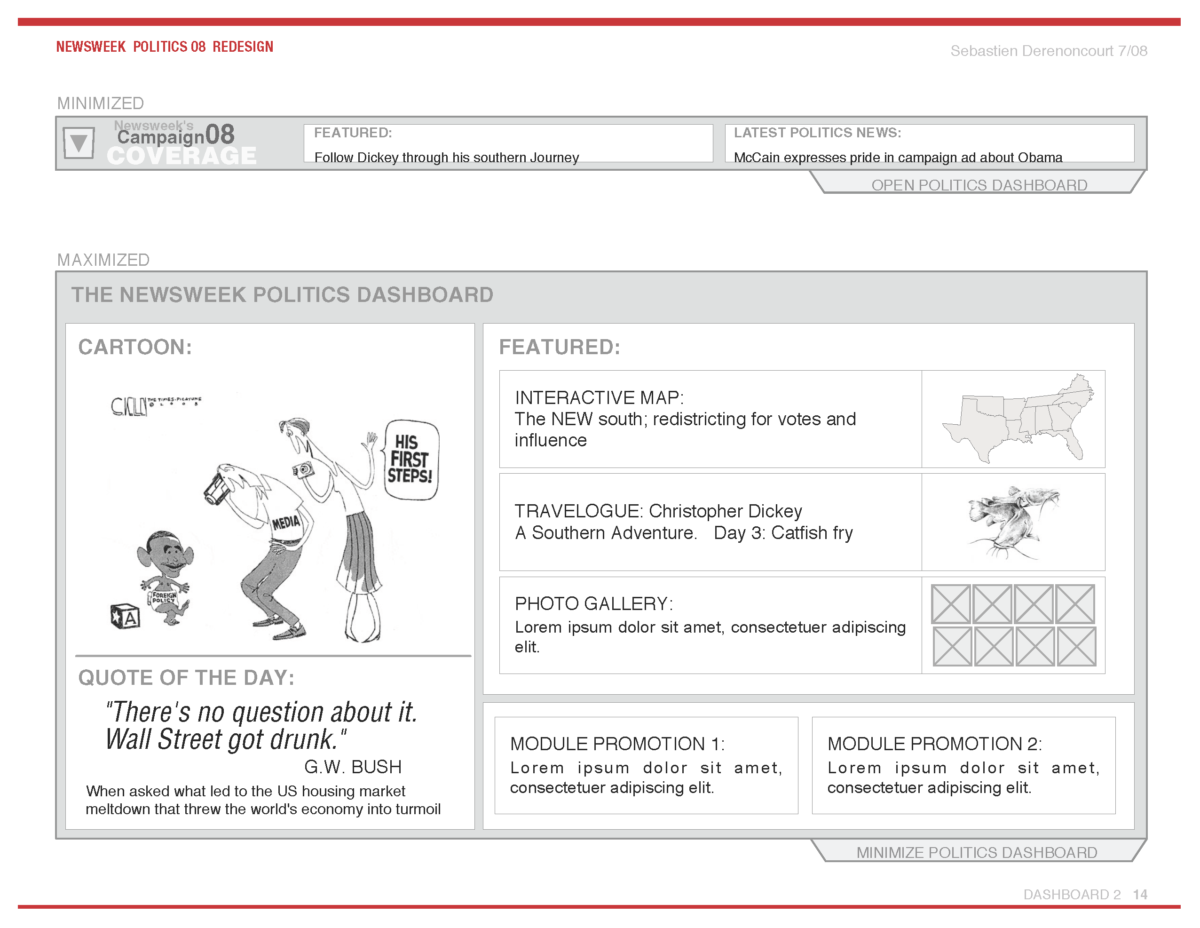 Here is a wireframe deck showing a sitemap of the politics content on the website as well as different versions of the two features individually and in their site position.